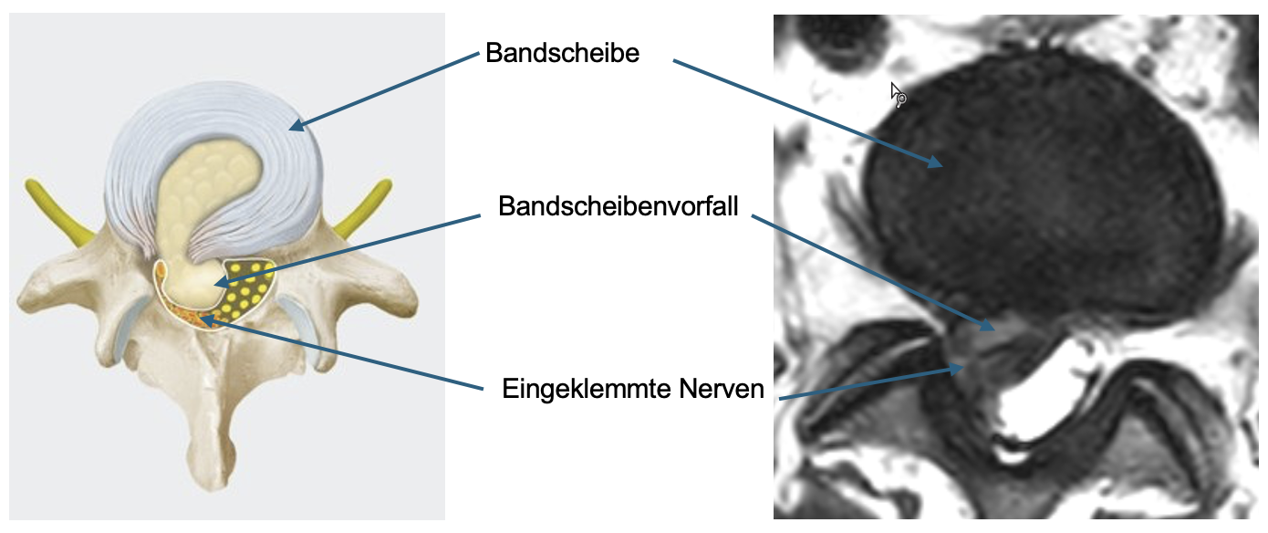Bandscheibenvorfälle stellen eine häufige Ursache von Rückenleiden dar. Die Bandscheiben (Diskus) sind ovale "Polster" welche zwischen den Wirbelkörpern liegen. Sie bestehen aus einem äusseren derben Ring aus Faserknorpel (Anulus fibrosus) und einem relativ weichen Kern (Nukleus). Prinzipiell erfüllen sie 3 wichtige Funktionen: Sie federn die Last des Körpergewichts ab, sie ermöglichen eine Beweglichkeit zwischen den Wirbeln als eine Art Kugellager und sie verbinden gleichzeitig die Wirbelkörper miteinander und sorgen so für die Stabilität des Segements (2 angrenzende Wirbel).Im Falle eines Risses des äusseren Rings (Anulus) kann der Kern oder Teile von ihm austreten und auf einen oder mehrere Nerven drücken.