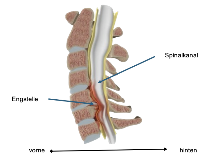 Aus verschiedenen Gründen, vor allem durch Verschleissprozesse im Laufe des Lebens, kann sich der Kanal allmählich verengen, was als Spinalkanalstenose bezeichnet wird. Dies führt zum einen zu einer Vorwölbung der Bandscheibe in den Kanal, zum anderen zur Arthrose in den kleinen Wirbelgelenken (Facetten). Auch ein Gleitwirbel (Spondylolisthese) kann zu so einer Verengung führen. Am häufigsten passiert dies an der Lenden- und an der Halswirbelsäule.
