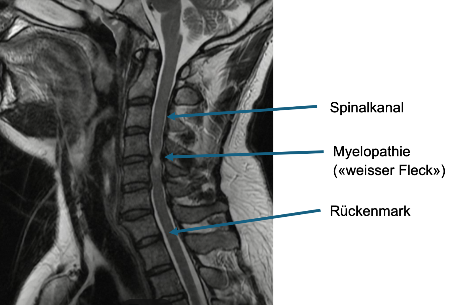 Bei diesen Symptomen kann es sich bereits um eine Schädigung des Rückenmarks (Myelon) handeln, dann redet man von einer zervikalen Myelopathie.