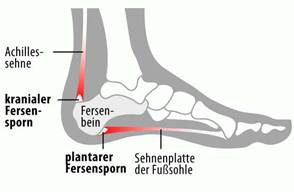 Ursache ist eine Reizung der ansatznahen Plantaraponeurose. Dieses starke Band spannt sich an der Fusssohle aus und setzt am Fersenbein an. Seine Aufgabe ist das Längsgewölbe des Fusses zu stabilisieren. Es ist entspricht somit dem „zuggurtenden“ Seil eines Krans, welches Zugkräfte in Druckkräfte umwandelt und vor dem Abbrechen des Hebelarms schützt.