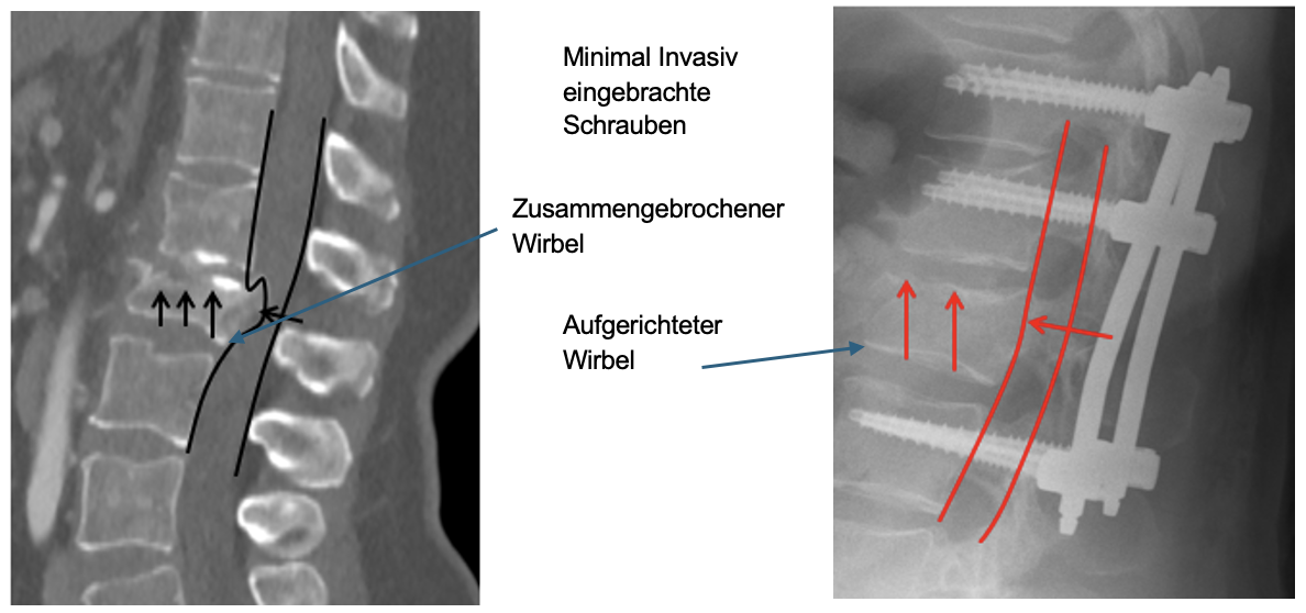 Hochgradige Frakturen benötigen allerdings oft auch eine zusätzliche Stabilisierung mit Schrauben. Diese können in den meisten Fällen minimalinvasiv in den Wirbel mit Zement verankert werden.