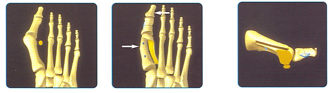 Häufig ist es auch zusätzlich notwendig, das ebenfalls verkrümmte Grundglied der Grosszehe zu korrigieren. Dies kann durch Entnahme eines entsprechenden Knochenkeils bewirkt werden. Die Fixation erfolgt hier mit einer Spezialklammer, die eine sofortige Stabilität garantiert.