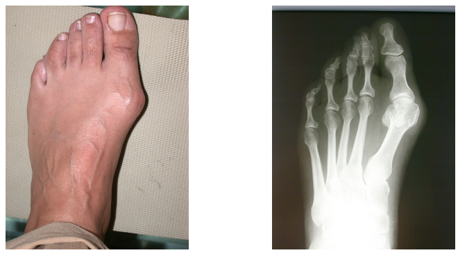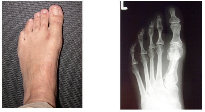 Symptome: Am Anfang bestehen Schmerzen lediglich in engen Schuhen oder nach langem Gehen/Stehen über der Exostose ("Ballen"). Die Deformation ist meist minimal, kann aber ausserordentlich weh tun.