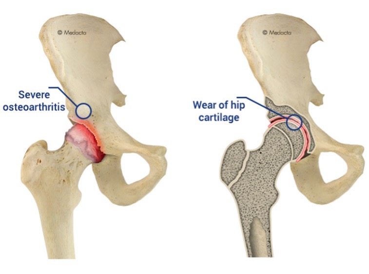 Schematische Darstellung einer Hüftarthrose mit Abnutzung des Knorpels (Fa. Medacta)