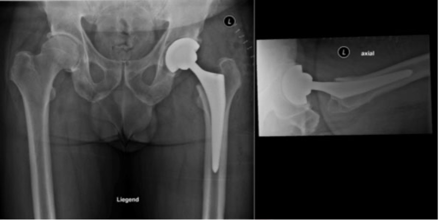 Postoperatives Röntgenbild nach einerHüfttotalendoprothese (links)