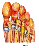 Es handelt sich hierbei um eine Schwellung der Nerven, die zwischen den Mittelfussknochen zu den Zehen führen und auf Höhe der Grundgelenke "eingeklemmt" werden, bevor sie sich in die Zehennerven aufteilen. Betroffen sind vorwiegend Patienten mit Spreizfüssen, vor allem beim Tragen von etwas engen Schuhen. Die entstehenden Schmerzen können so heftig werden, dass die betroffenen Patienten mitten auf der Strasse die Schuhe ausziehen müssen, wodurch recht schnell eine kurzfristige Linderung eintritt. Eine spontane Heilung ist allerdings nicht zu erwarten. Am häufigsten treten Morton-Neurome zwischen den Zehen 3 und 4 auf, gefolgt von denjenigen zwischen den 2. und 3. Zehen und (selten) den 4. und 5.
