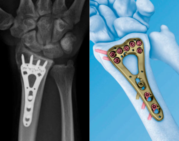 Beispiel eines handgelenksnahen Bruches der Elle (Firma Depuy Synthes) und Beispiel einer Speichenfraktur (Depuy Synthes)