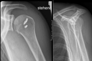 Postoperatives Röntgenbild der Schulter nach Refixation der Rotatorenmanschette mit Nahtankern
