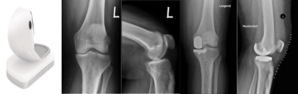 Unikondyläre Knieprothese / Oberflächenersatz Firma Mathys (BalanSys) und Beispiel einer entsprechenden prä- und postoperativen Bildgebung