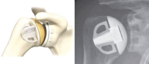 Etwas anders verhält sich die endoprothetische Versorgung bei Arthrose und gleichzeitig bestehendem schwerem Sehnenschaden (Cuff-Arthropathie). Je nach Ausmass der Schädigung der Rotatorenmanschette muss ein spezieller Prothesentyp zur Anwendung kommen. Es handelt sich hier um die sogenannte Inverse (umgekehrte) Endoprothese. Dabei wird, anders als bei den bereits beschriebenen Prothesentypen, der Oberarmkopf zur Pfanne und die Schulterpfanne zum Kopf.