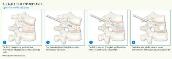 Bei der Kyphoplastie werden zuerst zusätzlich 2 Ballone ins Zentrum des gebrochenen Wirbelkörpers eingeführt und mit hohem Druck mit Wasser aufgeblasen. Damit kann der eingebrochene Wirbelkörper wieder „aufgeblasen" und so aufgerichtet werden.