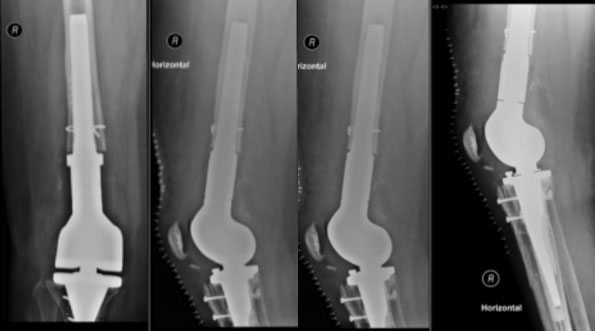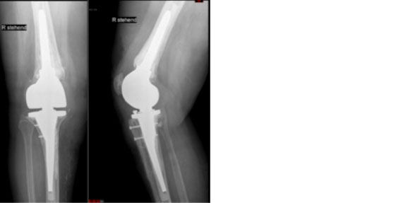 Postoperatives Röntgenbild nach Wechsel der gelockerten Knieprothese